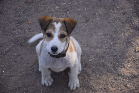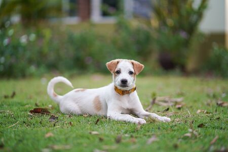 A cute puppy looking at the camera, white Jack Russell Terrier puppy Having fun in summer