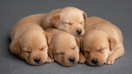 This heartwarming image captures four adorable puppies peacefully sleeping on a soft gray background, emphasizing their innocence and warmth.