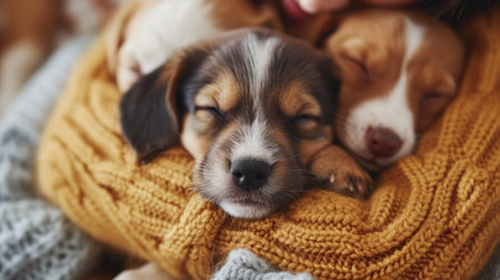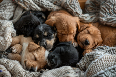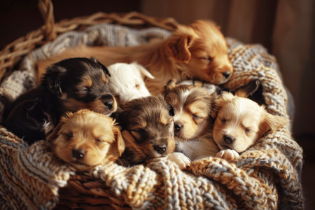 A group of adorable puppies snuggles together in a basket, wrapped in a warm knitted blanket. The cozy scene radiates warmth, comfort, and pure cuteness, capturing a peaceful moment of rest.