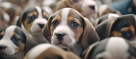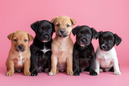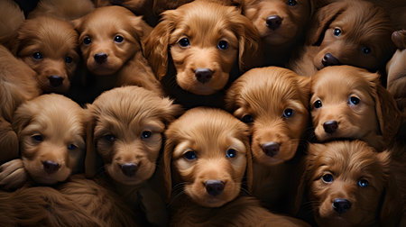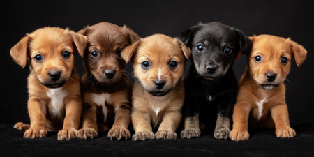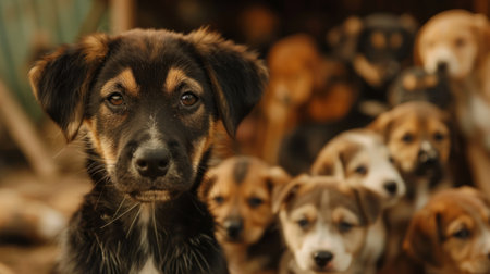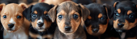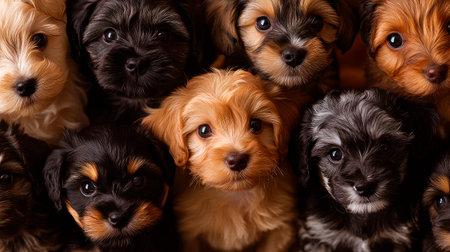 Group of adorable black and brown puppies with soulful eyes closely cuddling together, expressing warmth and innocence