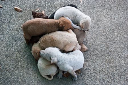 Cute stray dogs lying on ground outdoors, closeup. Homeless pet
