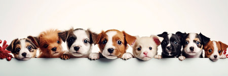Christmas banner with cute puppy. Group of funny dogs above white banner looking at camera. Christmas signboard or gift card for pet shop or vet clinic