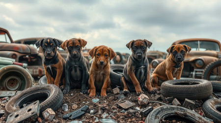 Five puppies are gathered in a junkyard, sitting on a pile of old tires and scattered debris.