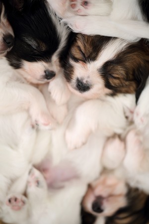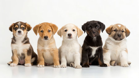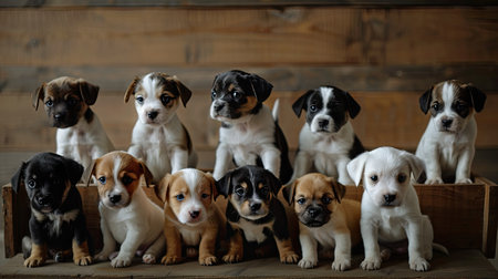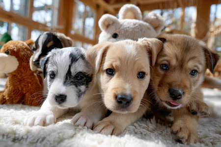 Diverse puppies sitting together home studio editorial photography cozy indoor environment close-up viewpoint