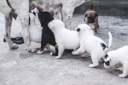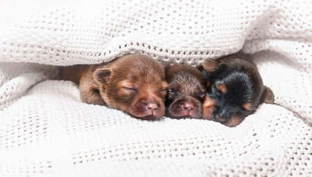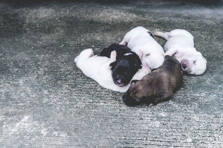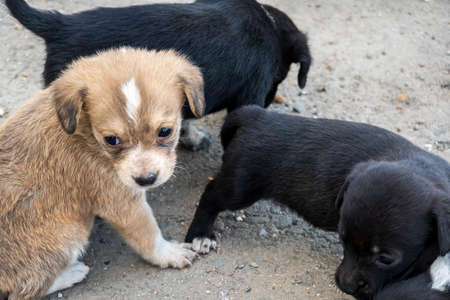 Three cute defenseless puppies explore the world outside. Selective focus.