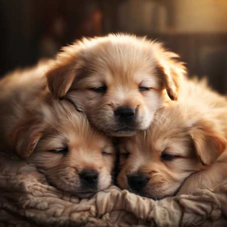 A heartwarming scene featuring five adorable golden retriever puppies sleeping peacefully in a plush cozy bed. Their soft fur and sweet expressions evoke feelings of comfort and joy.