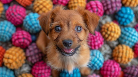 cheerful puppy surrounded by colorful toys, ideal backdrop for dog training concept with room for text