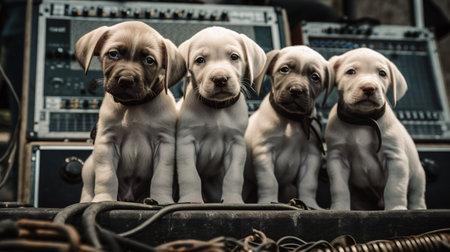 Cute white Labrador puppies sit in row and pose looking at camera. Generative AI