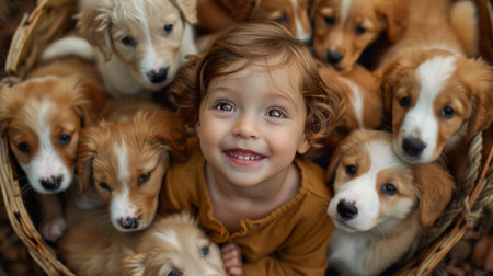 A young child sits in a basket surrounded by a litter of adorable puppies. The girl is happily interacting with the playful puppies, creating a heartwarming scene.
