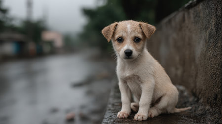 A cute puppy sits on a wet road, gazing softly at the viewer. The blurred background and gentle rain create a serene atmosphere, capturing pure innocence.