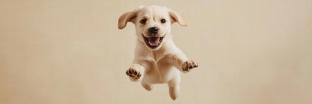 A playful puppy joyfully leaps in mid air with a big smile, embodying happiness and energy against a plain background with ample space for text.