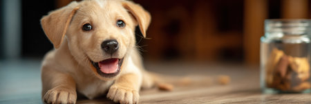 A joyful puppy lies on the floor, looking at a jar filled with treats, showing its playful spirit and eagerness for snacks.