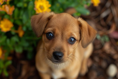 Close-up portrait of an adorable brown puppy with soulful eyes surrounded by vibrant flowers in a peaceful and tranquil garden. Perfect for animal lovers and horticulture photography enthusiasts