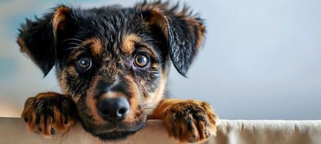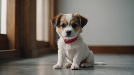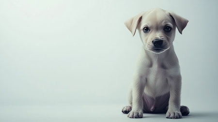 An adorable puppy sits calmly against a minimalistic backdrop, showcasing its expressive eyes and soft fur. Perfect for animal lovers and pet enthusiasts.