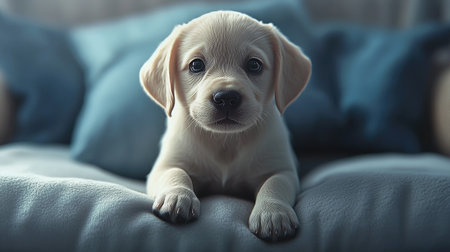 A delightful and adorable puppy resting on soft couch cushions, showcasing innocence and curiosity. Perfect for pet lovers and animal enthusiasts.