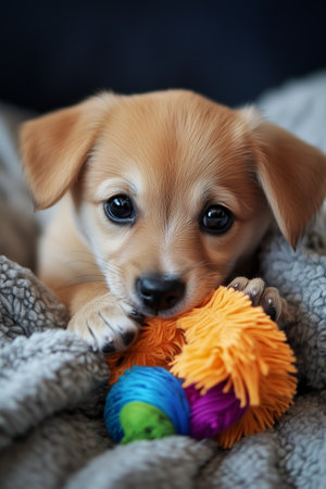 A playful puppy chewing on colorful toys while nestled in a cozy blanket, showcasing the joy of pet companionship indoors