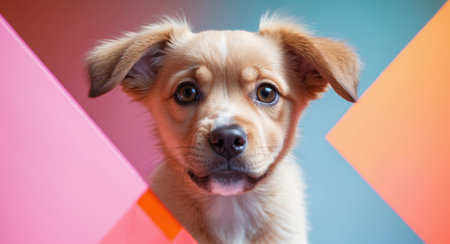 AI Generated. Adorable puppy on vibrant colorful background with orange and pink panels