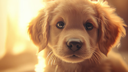 Fluffy, fat golden retriever puppy in a close-up, soft fur and big eyes catching the light as it looks directly at the viewer, warm indoor setting