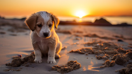 Photo of a curious puppy exploring a sandy beach at sunset