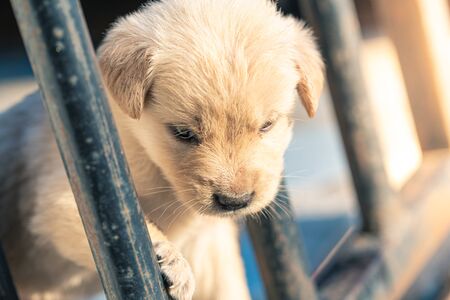 Golden Retriever puppies look in cages detail animal pet art blur