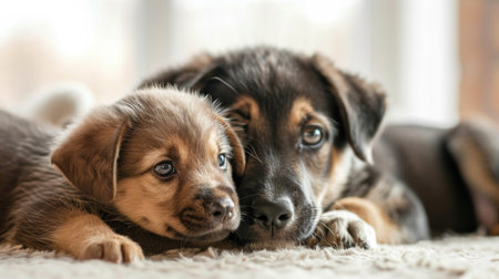 A tender connection is felt as the puppies lock eyes with the camera,.