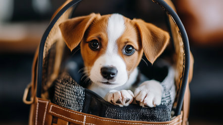 Curious Beagle Puppy Sitting Comfortably in a Stylish Pet Carrier at Home
