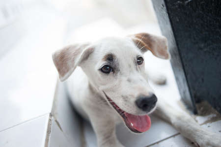 White labrador puppy resting outdoor. Cute white dog. White Labrador Retriever is lying in summer day