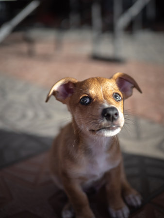 A charming young dog with big, expressive eyes gazes curiously at the camera, radiating warmth and innocence. This heartwarming close-up captures the playful spirit and loyalty of canine companions. Perfect for pet lovers and animal photography enthusiasts.