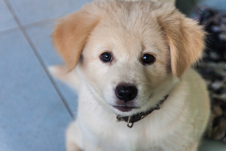 Cute golden retriever puppy sitting on the floor and looking at camera