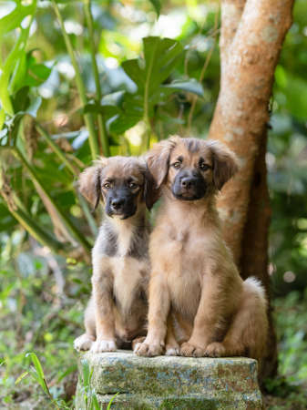 two homeless puppies dogs sit together in the grass