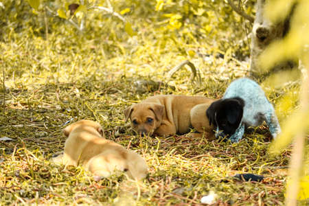 Stray puppies are playing under the bushes in wasteland