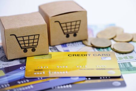 Credit card model and US dollar banknotes with shopping cart box : Financial development, Accounting, Statistics, Investment Analytic research data economy office Business company banking