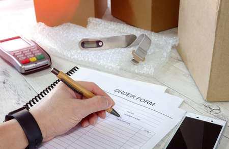 Startup business owner filling out order form at workplace. Packing goods for delivery.