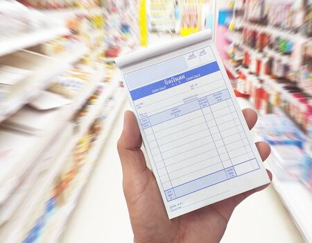 Holding invoice book with open blank page,blurred in shopping mall background.