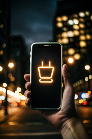 Hand holding modern smartphone displaying shopping cart icon symbolizing online shopping, e commerce, and mobile payment for convenient retail experience