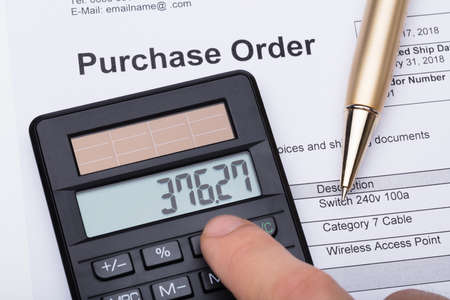 High Angle View Of Person Using Calculator On A Purchase Order Form And Pen