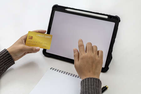 Woman are typing red credit card information on their tablets to pay for items purchased through online shopping websites, online shopping is an option that does not leave home but can shop.