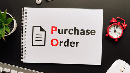 Business acronym PO or Purchase Order. Notepad with inscriptions on the desktop.