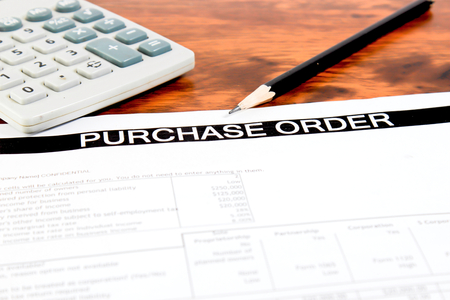 Purchasing order document, calculator and pen