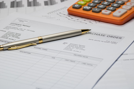 Purchase order form with pen and calculator