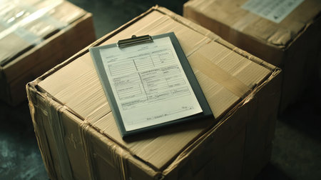 Stacked cardboard boxes in a warehouse with a clipboard holding delivery paperwork. Ideal for depicting logistics, shipping, and inventory management themes in a business setting.