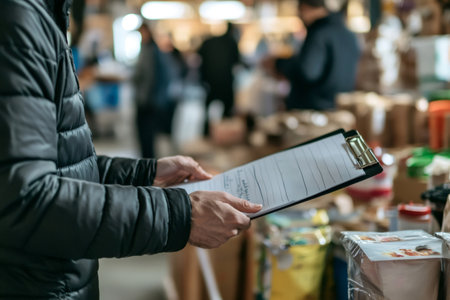 Volunteer holding clipboard and managing donations in warehouse, checking inventory and coordinating distribution of goods