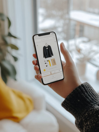 A hand is browsing through a user-friendly online store app, showcasing stylish clothing options against a backdrop of a warm indoor space with a window.