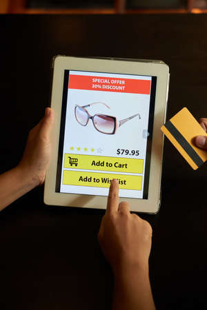 Hands of people shopping online as there is special offer on sunglasses