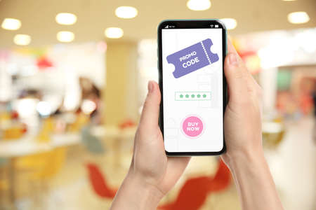Woman holding smartphone with activated promo code in shopping mall, closeup