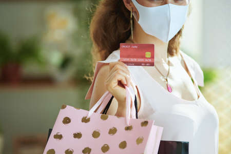 Life during coronavirus pandemic. Portrait of modern woman shopper in pink blouse with medical mask and paper shopping bags talking on a smartphone.