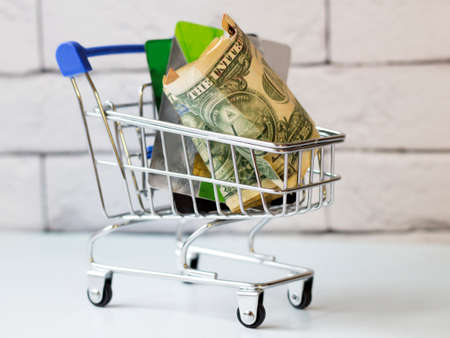 Money in a mini cart. Dollars, rubles and piastres on a black gradient background in a toy supermarket cart.