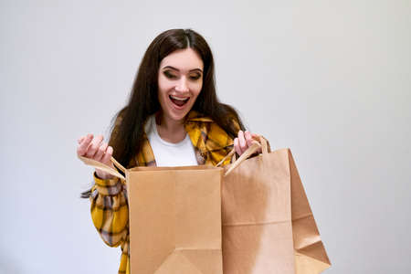 Black friday concept. Surprised woman holding a paper shopping bags and enjoys shopping