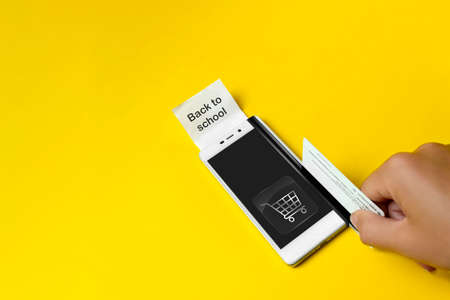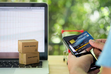 People are holding credit cards and smartphones to pay for products ordered through the website. Credit cards can pay for products online. Online shopping ideas.