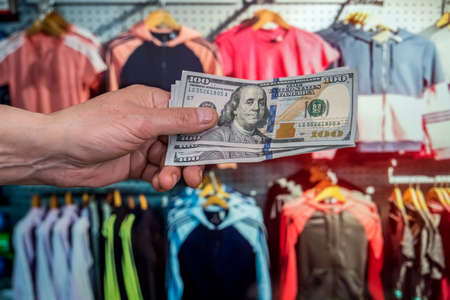 Male hand holding 100 us dollar money bills on mall store blurred background. customer concept